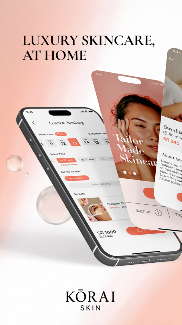 ENJOY THE CONVENIENCE OF KORAI SKIN NEW MOBILE APP Book personalized beauty and wellness treatments right from your home with just a few taps. Whether it's a rejuvenating massage, skincare, or a fresh hair and nail session, our experts are ready to pamper you. Download the app soon and enjoy exclusive offers and a seamless booking experience tailored to your needs., intuitive banking app with biometric authentication and real-time transactions.